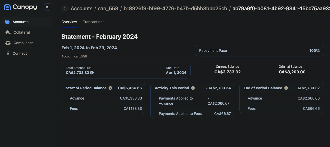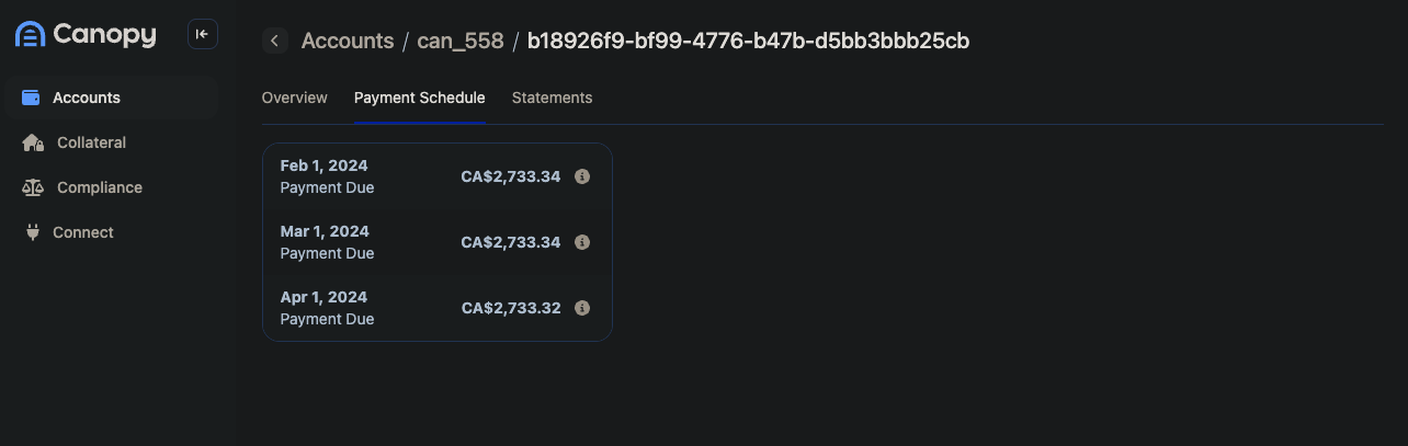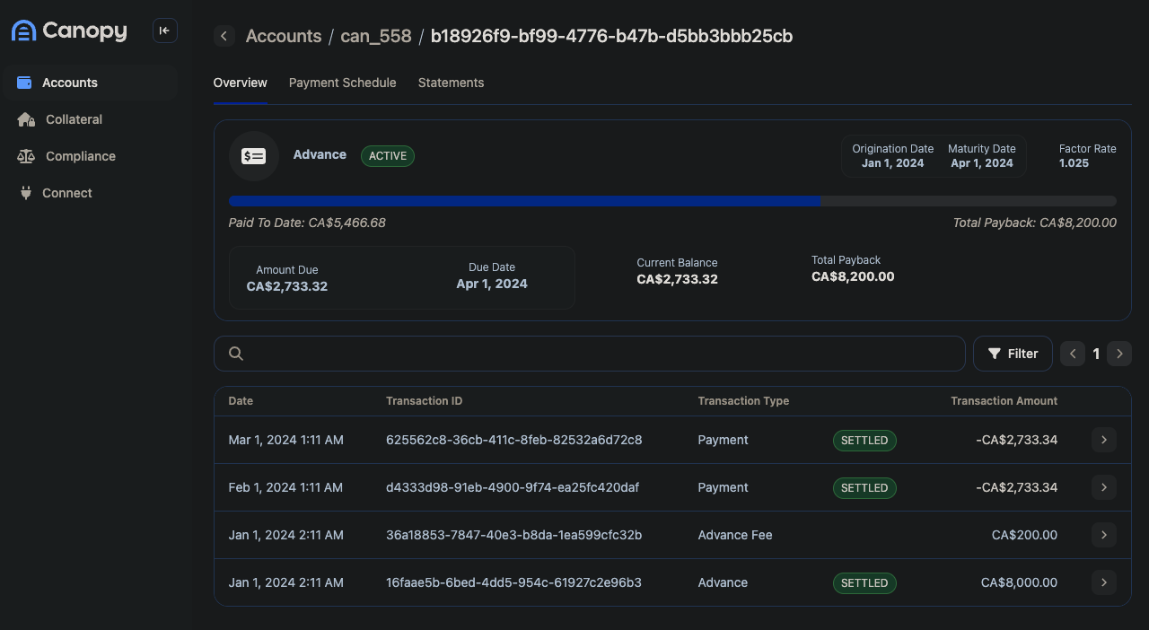 - Full servicing experience in Canopy OS, including repayment progress, schedules, and transaction history